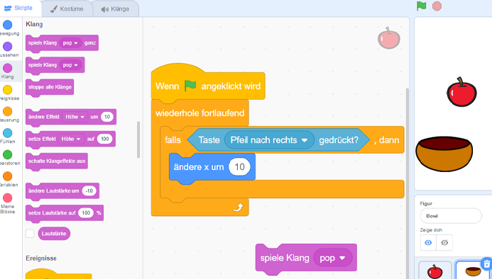 Fortgeschrittene Funktionen wie Soundeffekte und Benutzereingaben in ihren Projekten verwenden können. Die Fähigkeit entwickeln, mit anderen jungen Programmierern zusammenzuarbeiten, um gemeinsame interaktive Projekte zu gestalten. Die Fähigkeit besitzen, ihre Scratch-Programme zu testen und zu debuggen, um sicherzustellen, dass sie wie beabsichtigt funktionieren.