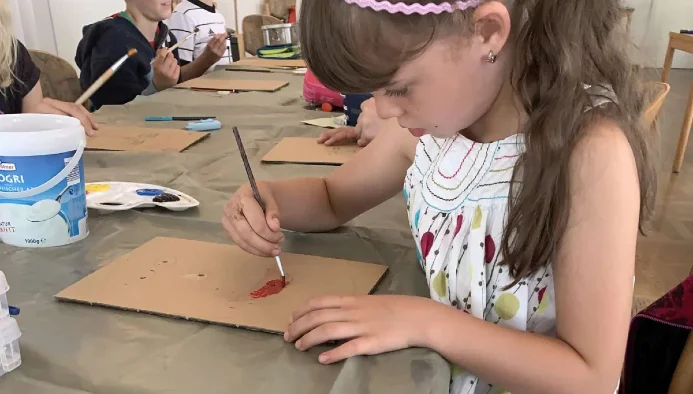 In der Früh starten wir täglich gemeinsam mit dem „morning circle“. Die Kinder bewegen sich, dehnen sich, machen kleine Bewegungsspiele, um erst mal in Gang zu kommen und voller Energie in den weiteren Tag zu starten. Im Anschluss ist Zeit für die erste „English & Schwerpunktprogramm session“, in der die Kinder in ihren Bezugsgruppen kreativ werden. Hier wird viel gemalt und gebastelt, an Projekten gearbeitet. Jeden Tag gibt es einen anderen Schwerpunkt, so dass für alle etwas dabei ist. Am ersten Tag liegt der Fokus auf dem Kennenlernen der anderen Kinder in der Gruppe.
